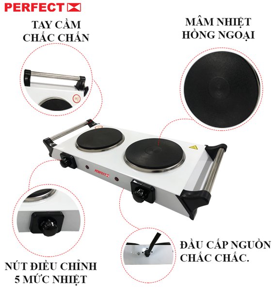 - Bếp điện đôi cao cấp perfect PF-HP888 có núm điều chỉnh 5 mức nhiệt khác nhau trực quan, điều khiển dễ dàng & có đèn báo riêng biệt cho mỗi bếp. Với điều khiển bằng nút vặn nhẹ nhàng, bạn sẽ hạn chế thấp nhất sự cố có thể xảy ra khi sử dụng (ví dụ bàn phím cảm ứng bị lỗi không điều chỉnh ở các loại bếp khác). Hơn thế nữa, thiết kế 5 mức độ nhiệt để bạn có thể nấu những món ăn yêu cầu mức nhiệt phù hợp như lẩu, món hầm, chiên xào, hay là hâm nóng thức ăn, pha sữa em bé,…Có đèn báo hiệu cho từng bếp giúp bạn kiểm soát hoạt động của bếp & tự ngắt khi quá nhiệt cực kì an toàn.