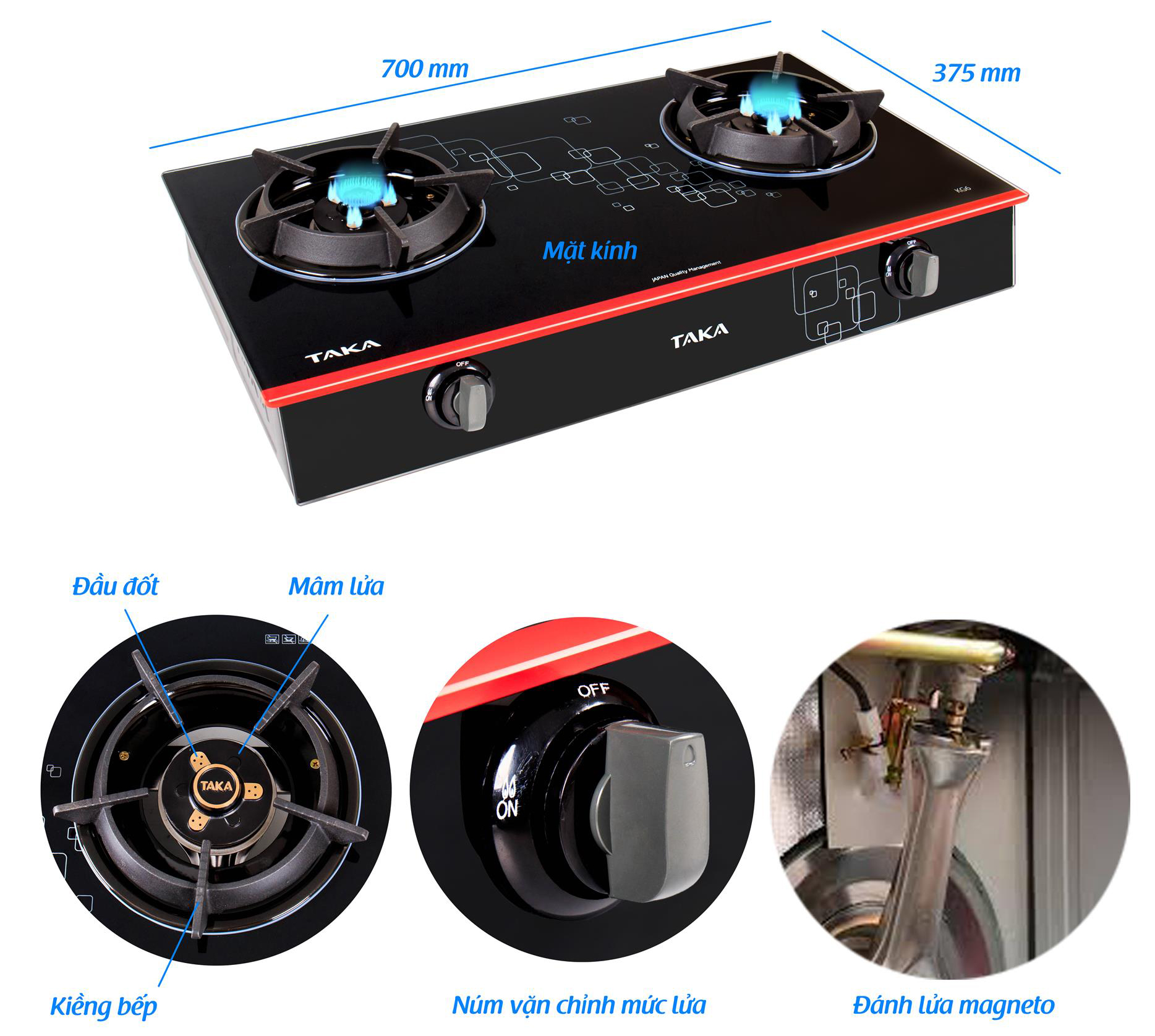 Bếp gas dương Taka KG6 thiết kế kiềng gang chắn gió giúp tiết kiệm nhiên liệu tối đa. Cơ chế đánh lửa magneto của bếp gas được kiểm tra chất lượng nghiêm ngặt theo quy trình Nhật Bản nên sản phẩm tạo ra ngọn lửa xanh, giúp nâng cao hiệu suất nấu nướng. Đồng thời, kiềng gas chắn gió giúp ngọn lửa gas xanh tập trung đáy nồi, tiết kiệm nhiên liệu và thời gian đun nấu.