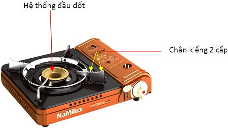 - Đặc biệt, kiềng bếp được làm bằng sơn tĩnh điện, chân kiềng được thiết kế 2 cấp bậc, giúp nâng đỡ chắc chắn, sử dụng cho nhiều kích cỡ nồi chảo, đây được xem là biện pháp hạn chế nhiệt truyền xuống lon gas tránh gây cháy nổ khi sử dụng.