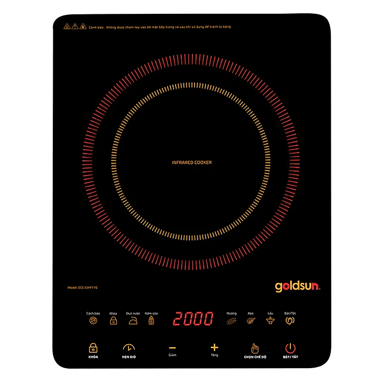 Với tổng công suất lên tới 2000W, bếp hồng ngoại Goldsun ECC-GHY116 giúp bạn nấu thức ăn nhanh và tiết kiệm nhiều thời gian. Người dùng sẽ không bỡ ngỡ khi sử dụng lần đầu bởi bảng điều khiển bằng tiếng việt dễ sử dụng và chức năng hẹn, bật tắt và khóa bàn phím.