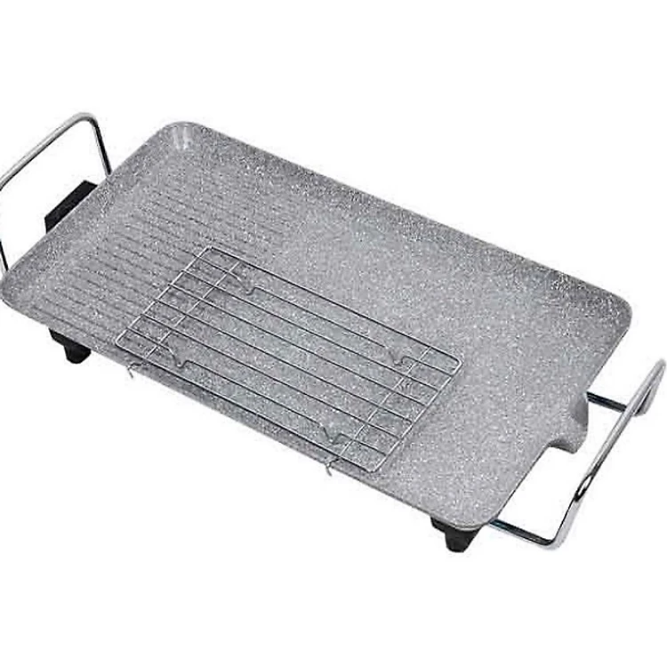 Bếp nướng điện không khói tạo nhiệt nhanh và đều giúp thực phẩm chín nhanh thơm ngon bổ dưỡng. Mặt bếp vân đá nguyên khối được chia làm 2 phần, phần trơn và phần gợn sóng. Phần mặt gợn sóng hạn chế dầu mỡ với món chiên nướng đồng thời tăng nét thẩm mỹ trên thực phẩm mà bạn nướng rất đẹp mắt