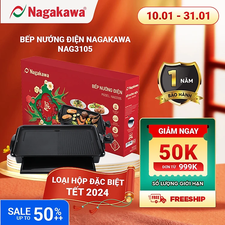 [HỘP QUÀ TẾT] Bếp nướng điện Nagakawa NAG3105 (2000W) - Bảo hành 1 năm - Hàng chính hãng