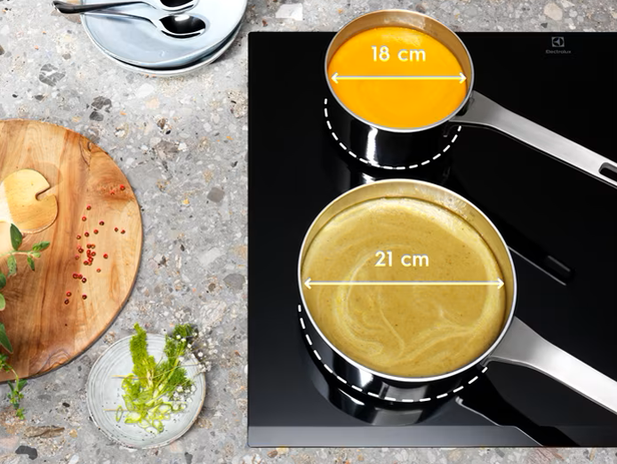 Diện tích bếp nấu tự động điều chỉnh theo kích thước nồi và chảo, cho phép điện năng chỉ truyền tới đúng vị trí đặt nồi, giúp bếp nấu tiết kiệm điện năng hiệu quả.