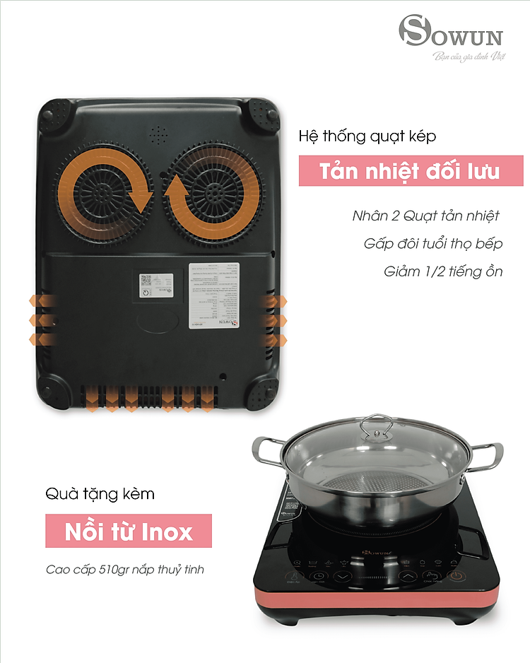 Sản phẩm được trang bị 2 quạt tản nhiệt lớn ở phía sau và 2 quạt bên hông để đảm bảo các linh kiện bên trong luôn được mát, giữ cho mâm từ có nhiệt độ ổn định trong suốt quá trình hoạt , giúp tăng gấp đôi tuổi thọ bếp và giảm 50% độ ồn của bếp.