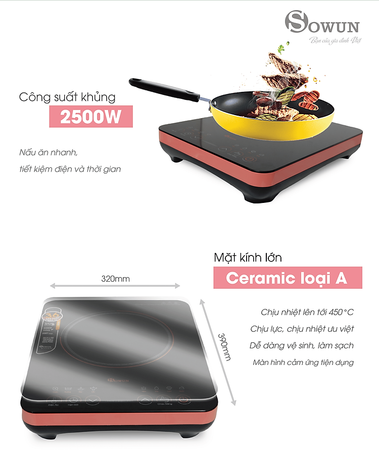 Bếp điện từ SOWUN SW 169S có ng suất cực khủng 2500W giúp quá trình gia nhiệt diễn ra nhanh. Cơ chế làm nóng trực tiếp đáy nồi bằng từ trường và nhiệt năng chỉ tập trung vào vùng cần nấu chín giúp thực phẩm chín nhanh, rút ngắn thời gian nấu nướng chỉ bằng 1/3. Đặc biệt , ng nghệ mâm từ kép được bảo hành chính hãng lên tới 36 tháng ,giúp toả nhiệt đều, giúp món ăn chín ngon hơn.