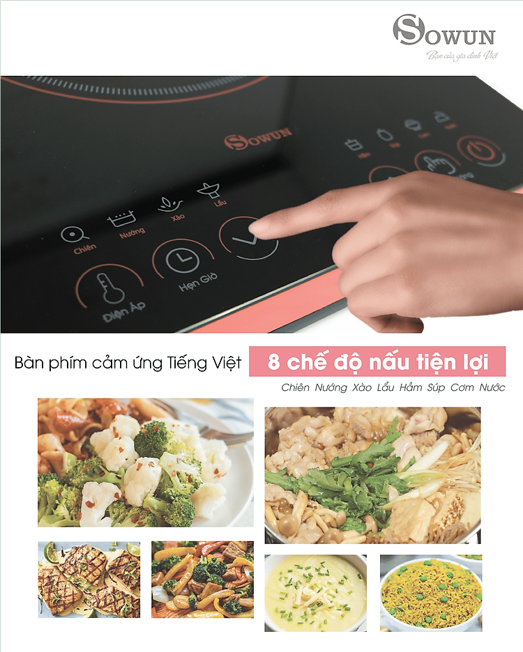 Bàn phím cảm ứng chỉ dẫn bằng Tiếng Việt siêu nhạy, chạm nhẹ là dễ dàng tuỳ chỉnh 8 chế độ nấu tự động gồm: Chiên – Nướng – Xào – Lẩu – Hầm – Súp – Cơm – Nước cho chị em nội trợ chế biến món ăn tiện lợi, đa dạng thực đơn mỗi ngày dễ dàng. Ngoài ra, bếp được trang bị chức năng hẹn giờ lên tới 240 phút giúp người dùng tối ưu thời gian, làm nhiều việc một lúc.