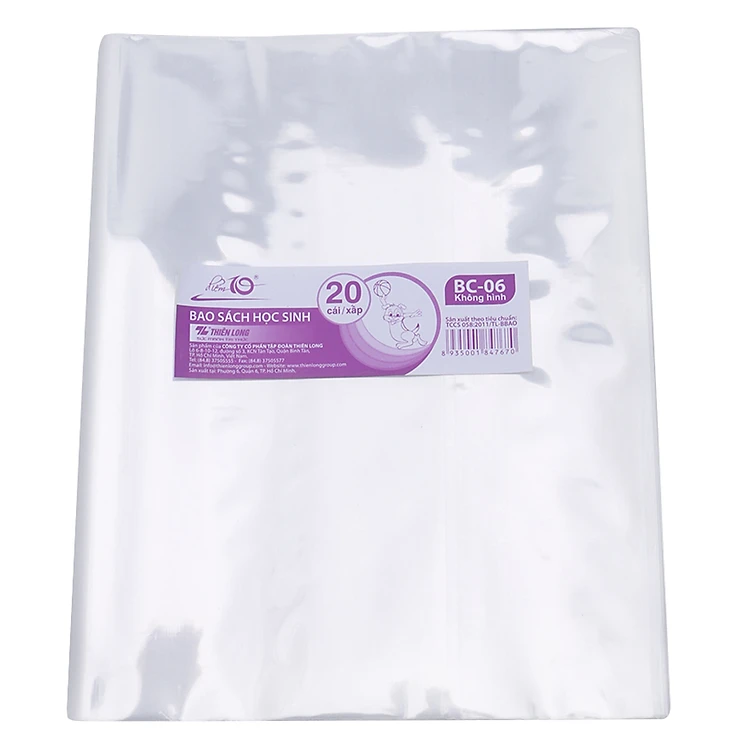 - Bìa Bao Sách Thiên Long BC-06 (20 Cái) được làm từ chất liệu nhựa OPP trong, nhựa dẻo, bền, bảo vệ tốt bìa sách bên trong. Sản phẩm được sản xuất theo công nghệ hiện đại, không có nhựa tái chế, không độc hại.