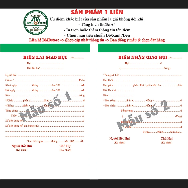 Sản phẩm Biên lai giao hụi 1 liên-Block 10 quyển-chọn mẫu in tên được thiết kế theo tiêu chuẩn chung với nhiều mẫu thiết kế sẵn hoặc từ sản phẩm mẫu đó bạn có thể thiết kế theo ý tưởng của Bạn và điểm cộng LỚN NHẤT cho sản phẩm này là quý khách có thể tuỳ ý cập nhật in thông tin tên đơn vị, địa chỉ và điện thoại với "số lượng đặt hàng thấp nhất cùng với mức giá tốt" mà không phải bỏ ra chi phí lớn để lưu kho sẵn.