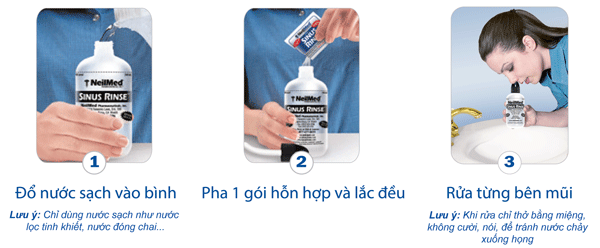 (Chú ý: Nên rửa sạch tay trước khi thực hiện các thao tác rửa mũi. Không nói chuyện, luôn thở bằng miệng trong quá trình rửa mũi, sau đó xì thật nhẹ để loại bỏ dung dịch còn lại trong xoang mũi)