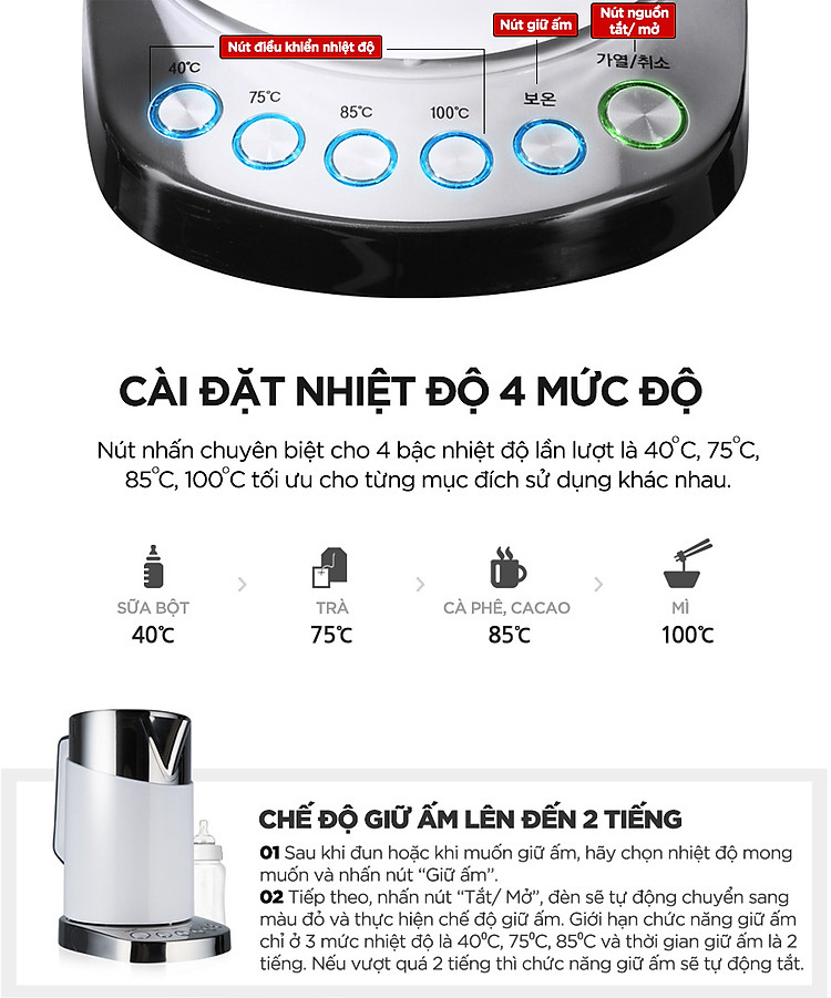 Cài đặt nhiệt độ 4 mức độ và chức năng giữ ấm thông minh.