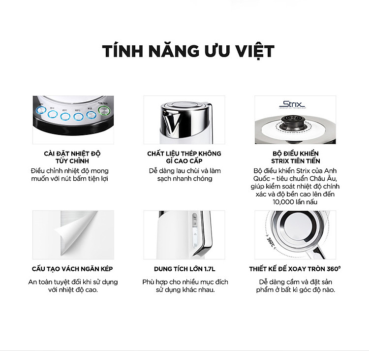 Dung tích 1.7 lít đáp ứng tốt nhu cầu pha trà, cà phê, mì tôm.