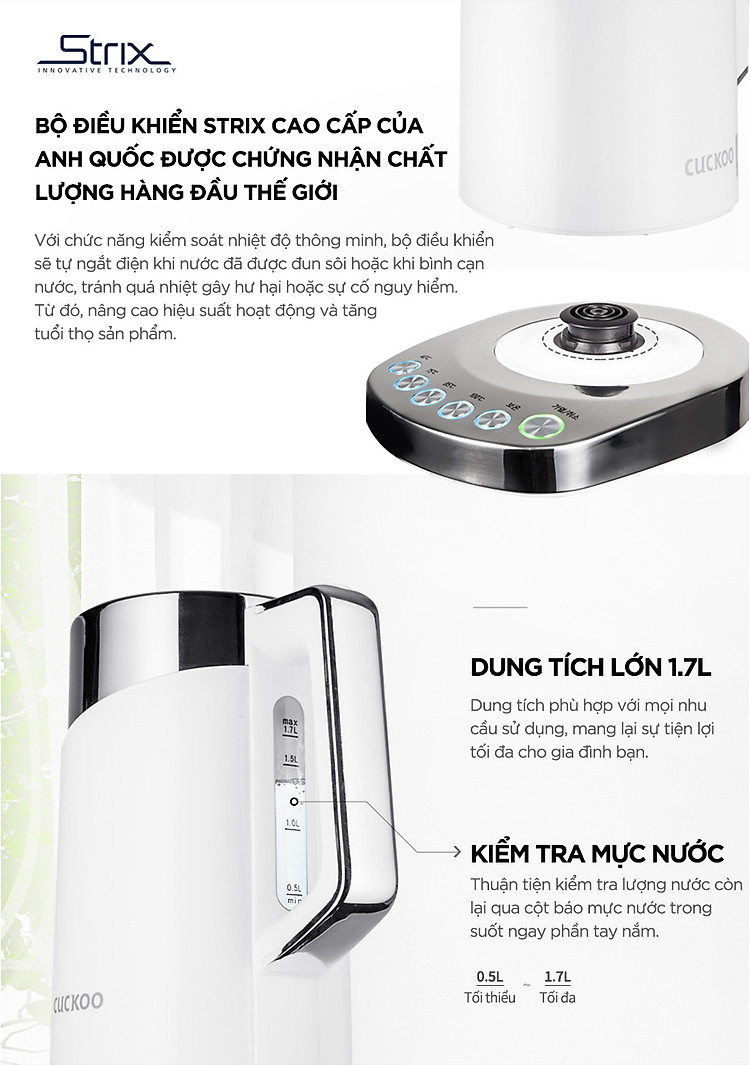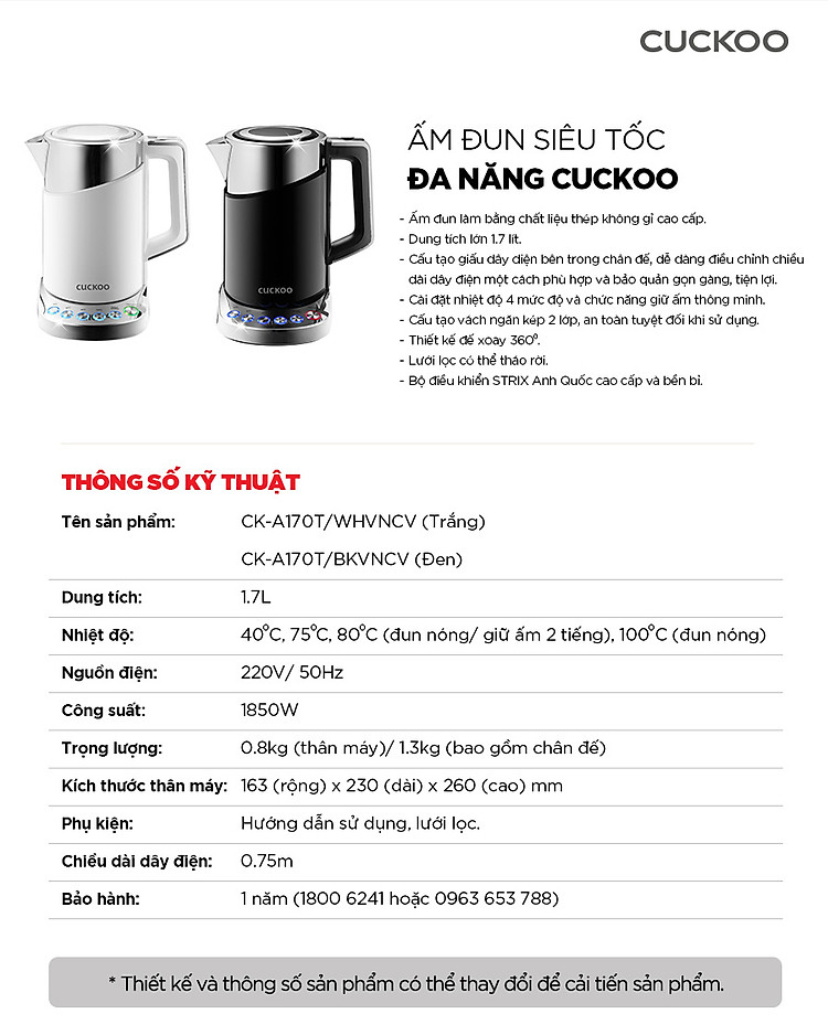 Bình đun siêu tốc đa năng Cuckoo CK-A170T dung tích lớn 1.7L - 1850W - Điều chỉnh nhiệt độ nước - Hàng chính hãng