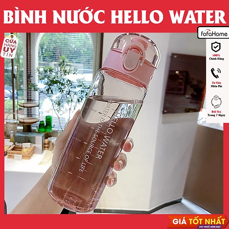 Bình Đựng Nước Nhựa Trong Thể Thao HELLO WATER Cute Dễ Thương 780ml Có Vạch Chia Và Quai Xách