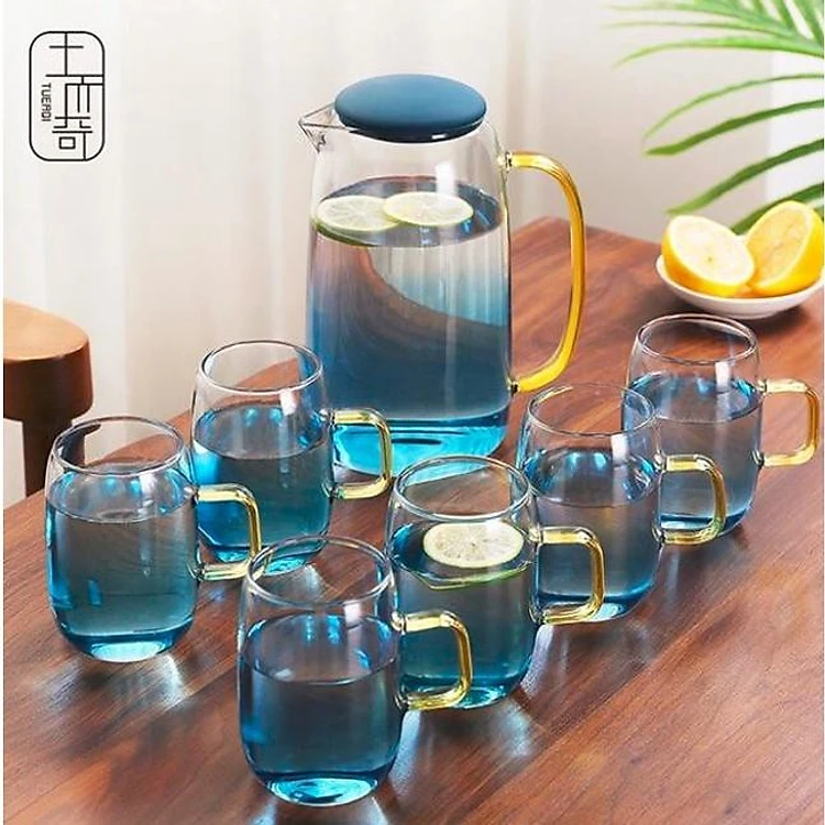 Bình đựng nước thủy tinh kèm 6 cốc màu xanh nước biển
