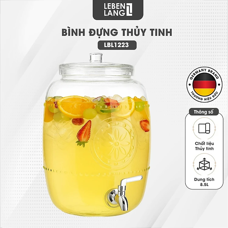 Bình đựng thủy tinh Lebenlang LBL1223, bình nước có vòi 8,5L dùng trong tủ lạnh, đựng trà - chính hãng