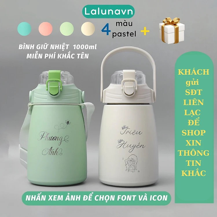 Bình giữ nhiệt Inox304 1000ml KHẮC TÊN bình nước 4 màu có ống hút giữ nhiệt 12h tặng Sticker trang trí-B115
