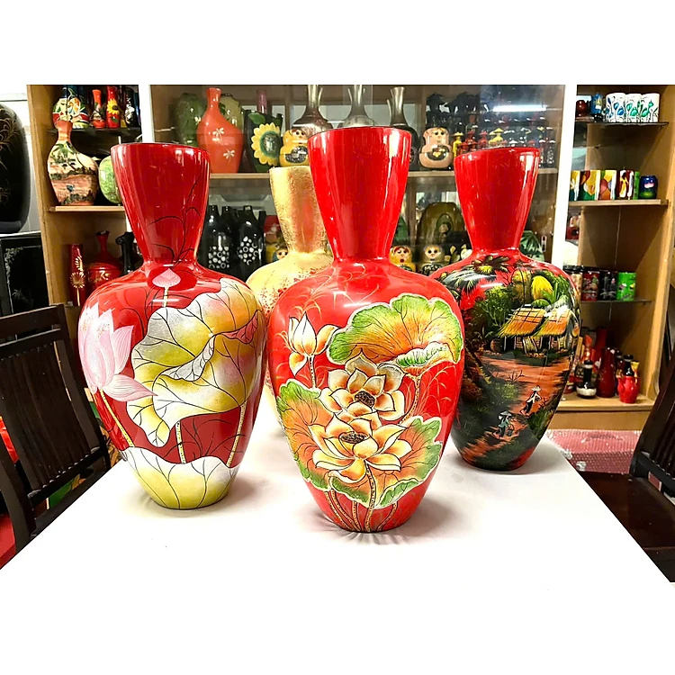 Bình hoa sơn mài 02 họa tiết phong cảnh quê hương việt nam size 55x28 cm