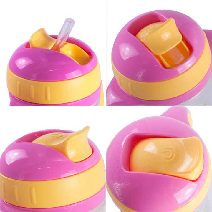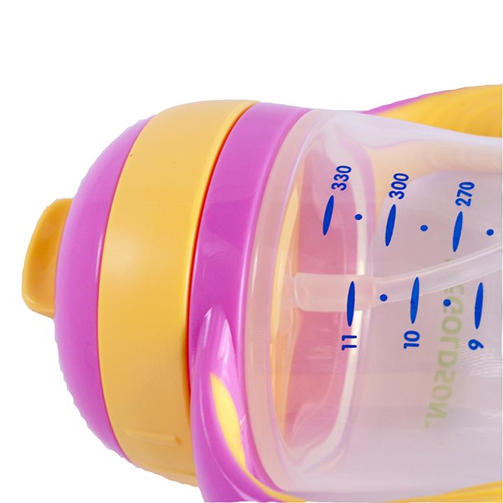 Bình có tay cầm chống trượt, mềm dẻo, có thể xoay 360 độ. Thân bình thon gọn, vừa tầm tay nên rất dễ cầm nắm; có in hình ngộ nghĩnh, màu sắc tươi sáng thu hút ánh nhìn từ bé; được in các vạch chia thể tích rõ ràng trên bề mặt, mực in an toàn thực phẩm, không độc hại.
