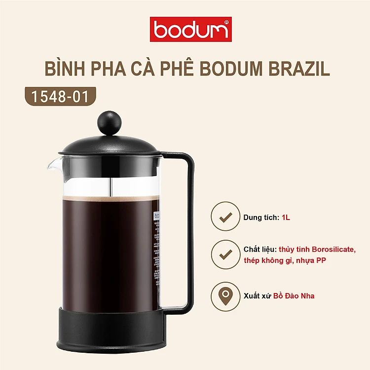 Bình pha trà, cà phê kiểu Pháp Bodum Brazil 1L-1548-01, xuất xứ Bồ Đào Nha