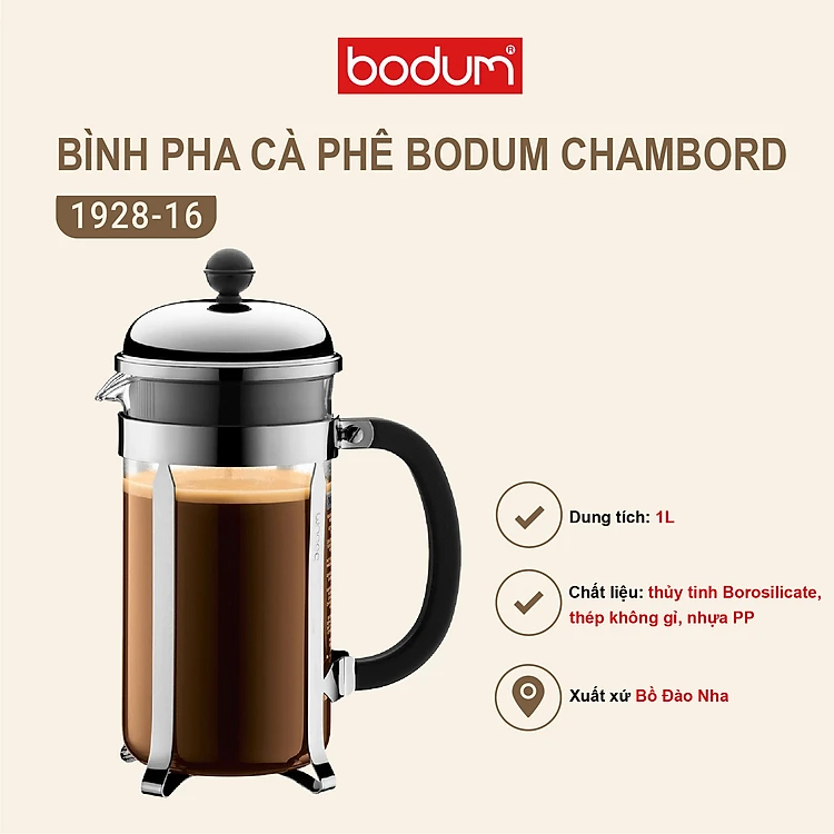 Bình pha trà, cà phê kiểu Pháp Bodum Chambord 1L màu inox 1928-16, xuất xứ Bồ Đào Nha
