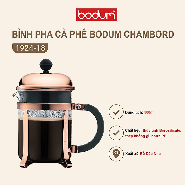 Bình pha trà, cà phê kiểu Pháp Bodum Chambord màu vàng đồng 500ml 1924-18, xuất xứ Bồ Đào Nha