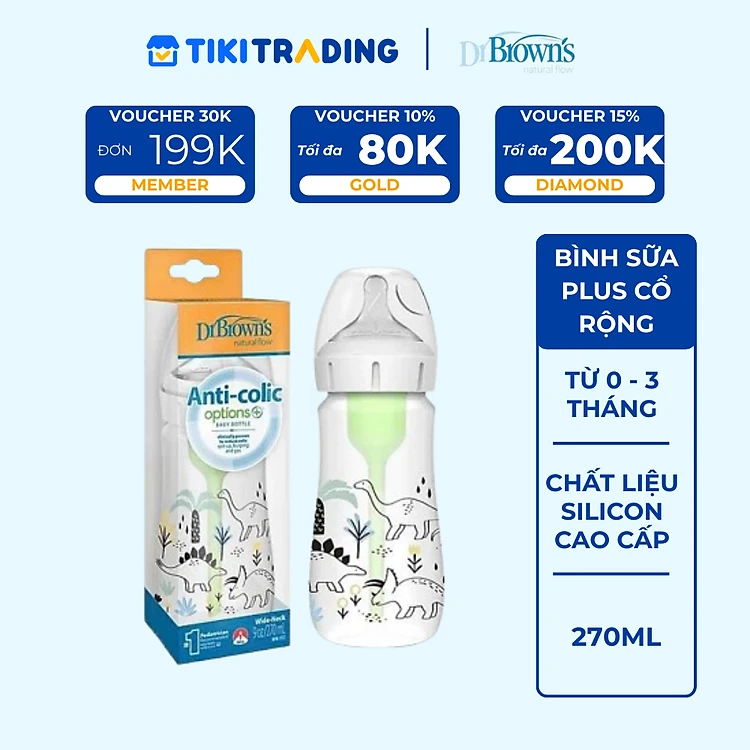 Bình sữa Dr.Brown's Options Plus cổ rộng 270ml PP TQ Dino Designs hình Khủng long