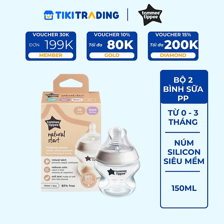 Bình Sữa PP Ty Siêu Mềm Tự Nhiên Tommee Tippee 150ml, Núm Ty Của Bình 0-3 Tháng