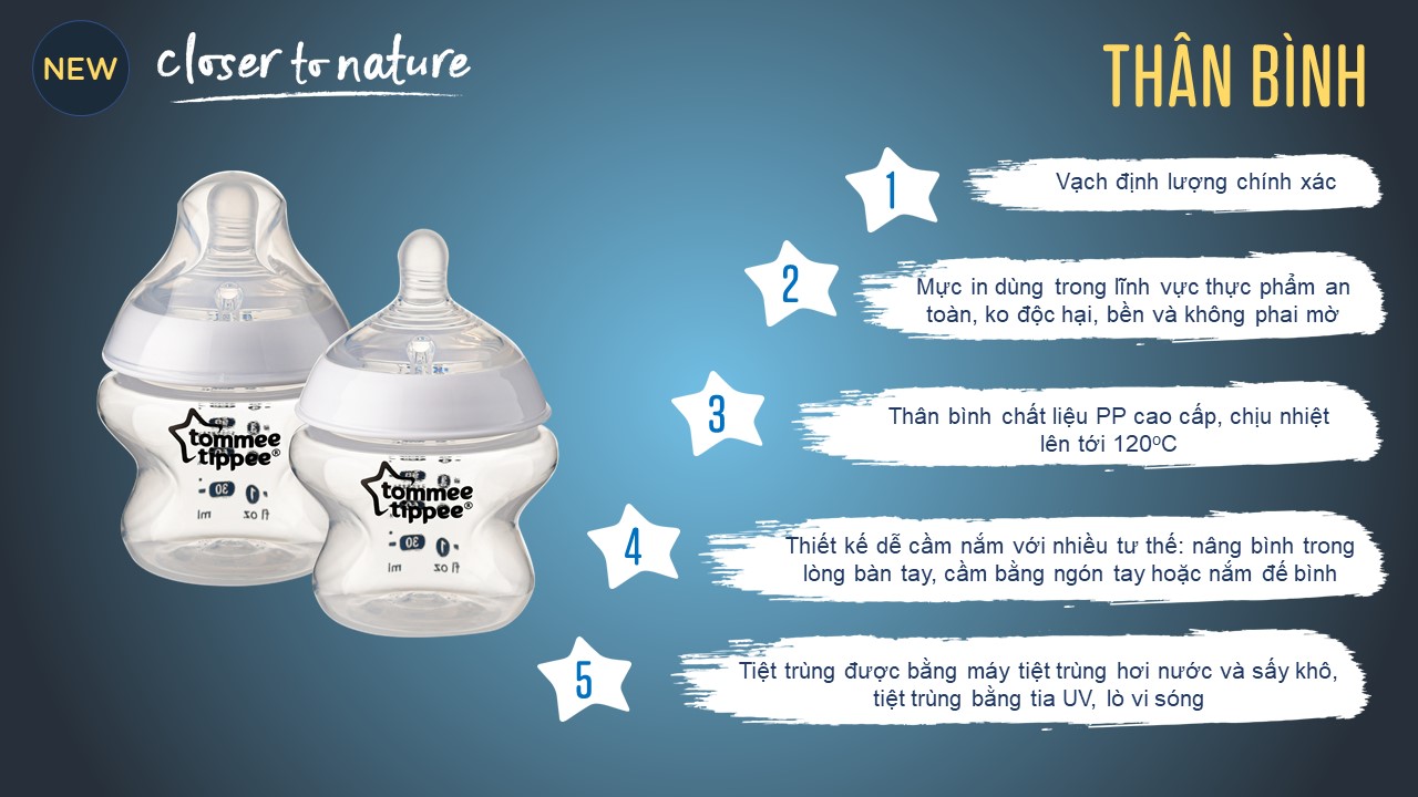 Không chứa BPA, với núm ty silicon siêu mềm tự nhiên và van chống đầy hơi hiệu quả, bình sữa Tommee Tippee Closer to Nature giành được nhiều giải thưởng trên toàn thế giới. Nhưng quan trọng hơn, 97% các bà mẹ khuyên dùng bình sữa Tommee Tippee cho những người bạn của họ! (Dựa trên khảo sát online năm 2012 với hơn 500 các bà mẹ, những người sử dụng bình sữa Tommee Tippee Closer to Nature)
