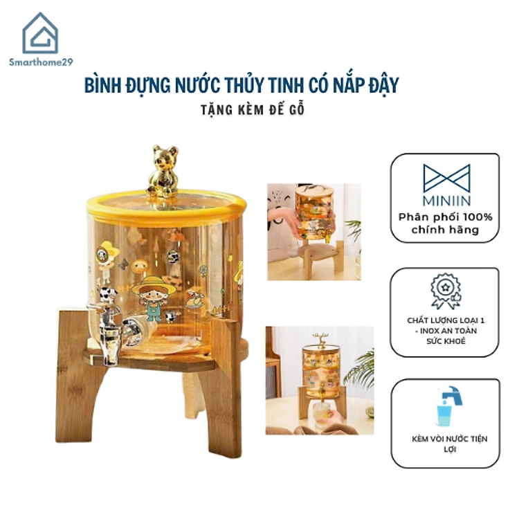 Bình Trà, Bình Đựng Nước Thủy Tinh Stiker Cao Cấp 2.5L và 3.5L Có Vòi, Có Nắp Đậy + Tặng Kèm Kệ Gỗ - Bình Pha trà, Nước Trái Cây- HÀNG CHÍNH HÃNG MINIIN