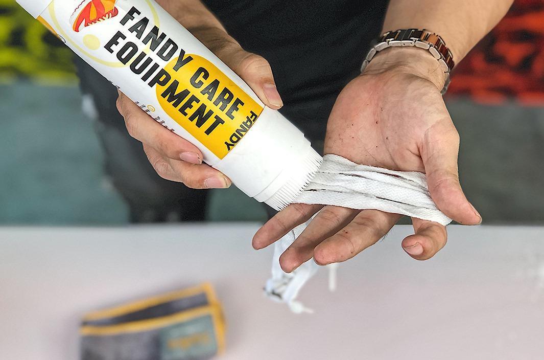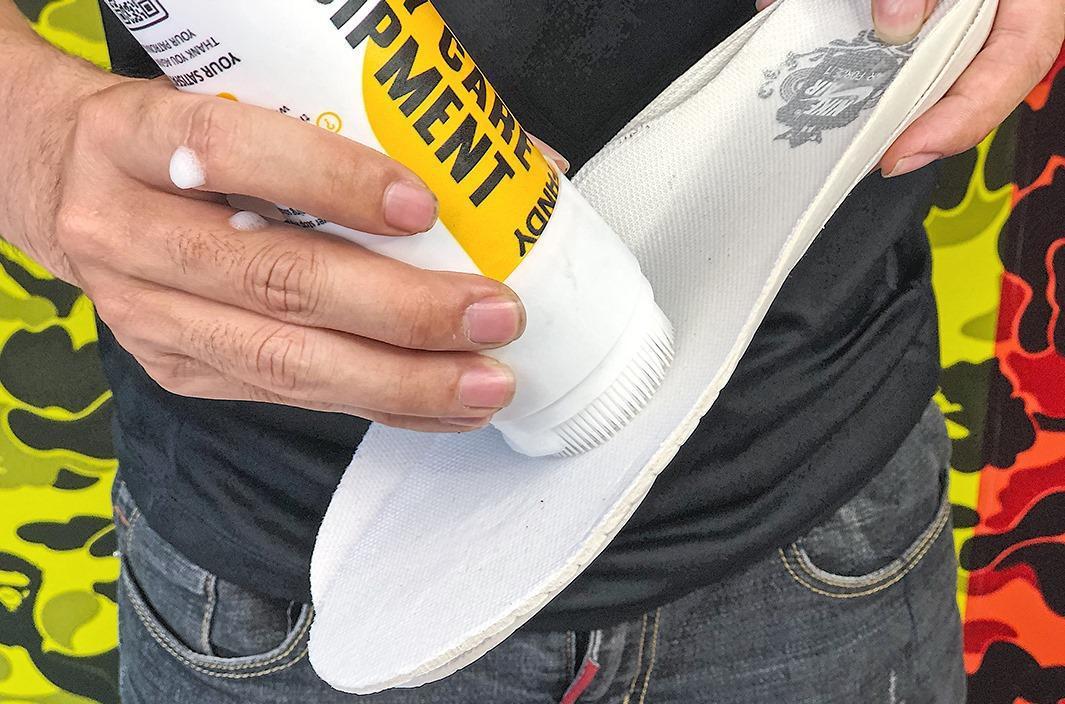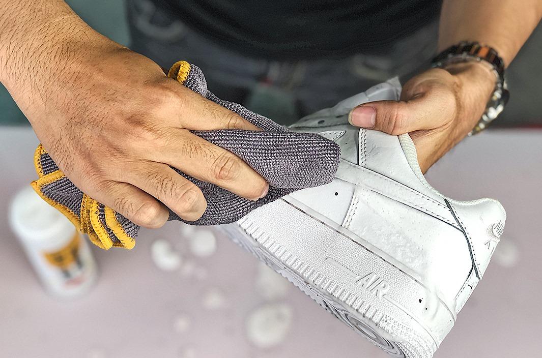 Bước 5 : Sử dụng khăn Nontwist Fandy được sản xuất từ 100% sợi bông cotton lau phần bọt vệ sinh dư sau đó bạn có thể clean tiếp đến phần đế và dây giày