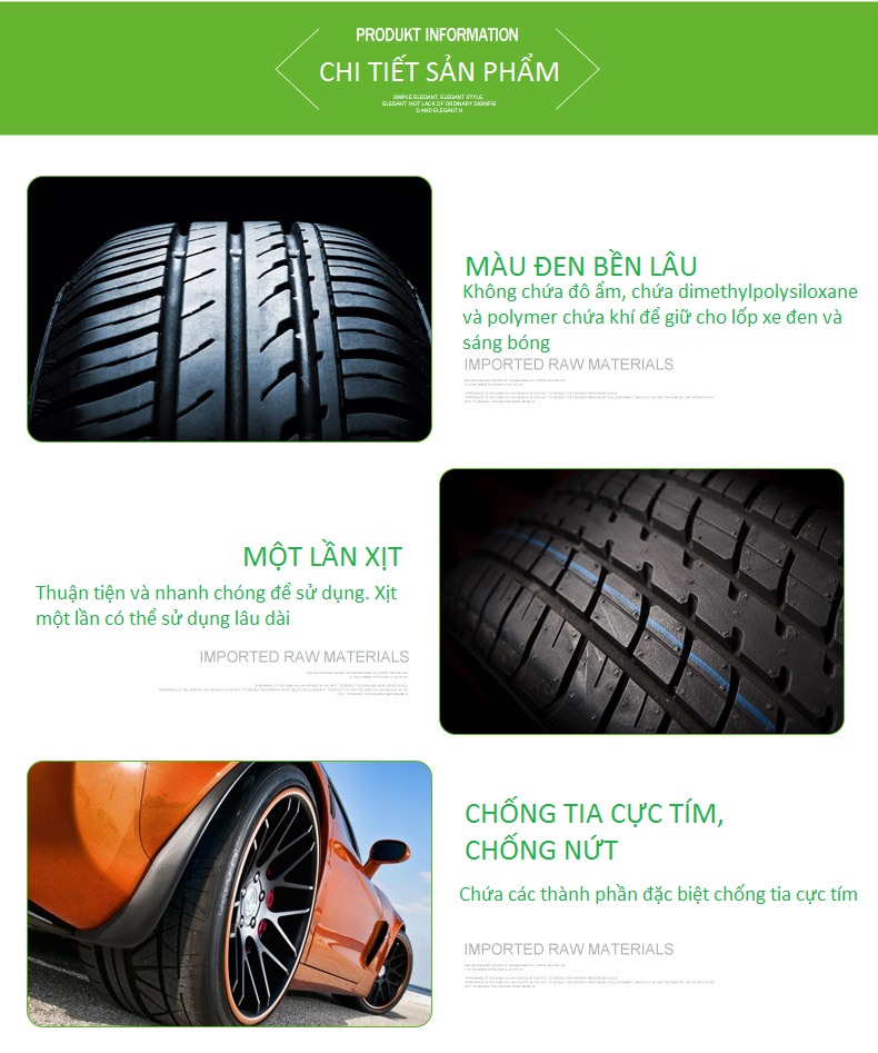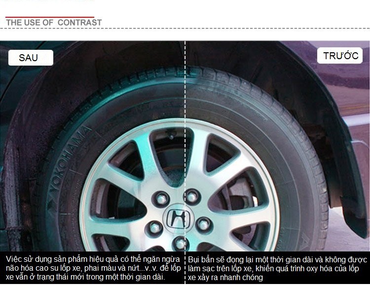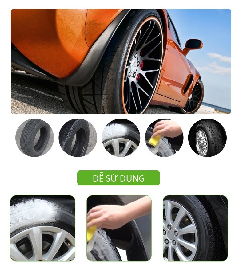 Công dụng: Công thức tiên tiến giúp tạo một lớp phủ bảo vệ trên bề mặt của lốp. Sản phẩm giúp khôi phục sự dẻo giai của cao su, làm sạch và lấy lại màu sắc đen bóng của lốp ô tô trở nên như mới.