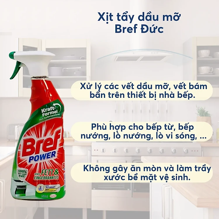 Bình Xịt Tẩy Rửa Đa Năng Bref Power 750ml, nhập khẩu Đức- Tẩy dầu mỡ, Tẩy Bếp, Thiết Bị Nhà Bếp, Nhà tắm, Inox, hiệu quả lên đến 99.9%.
