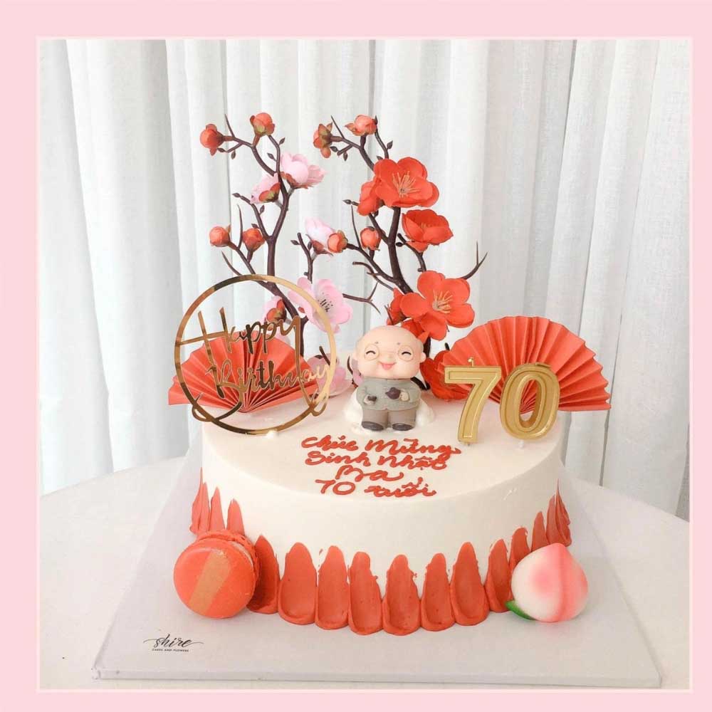 Bánh kem ngày mừng thọ với hình ảnh các cụ già trên mặt bánh (Nguồn: Internet)Mẫu bánh kem hình đào cũng là sự lựa chọn mới lạ ngày mừng thọ (Nguồn: Internet)