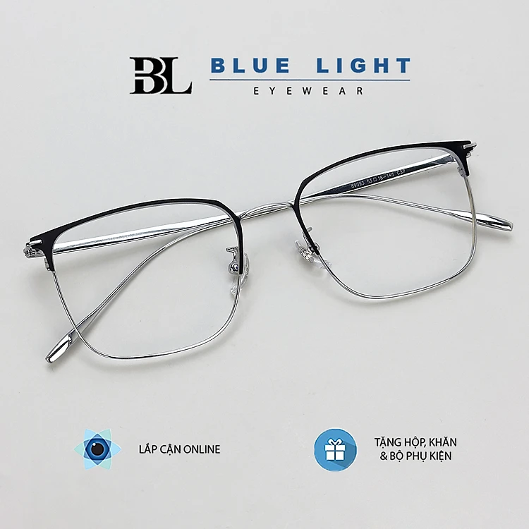 BLUE LIGHT - Gọng Kính Cận, Kính Giả Cận Nam Nữ TITANIUM Cao Cấp, Siêu Nhẹ, Mắt Vuông Thanh Mảnh, Đen, Bạc