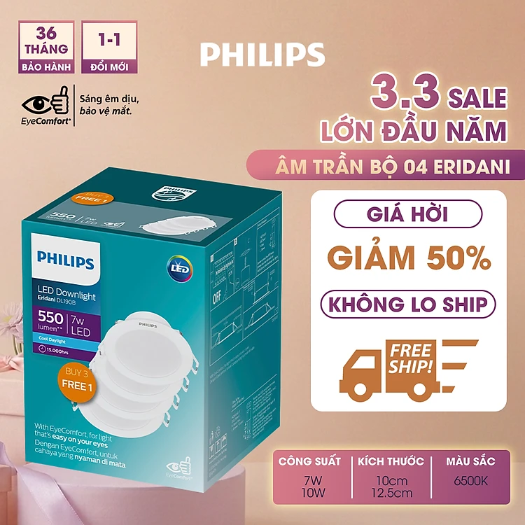 Bộ 04 bóng đèn âm trần Philips LED Eridani hiệu suất ánh sáng cao - Công suất (7W, 10W), ánh sáng trắng
