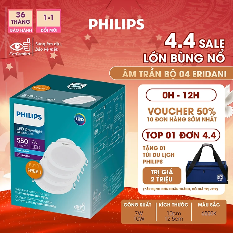 Bộ 04 bóng đèn âm trần Philips LED Eridani hiệu suất ánh sáng cao - Công suất (7W, 10W), ánh sáng trắng