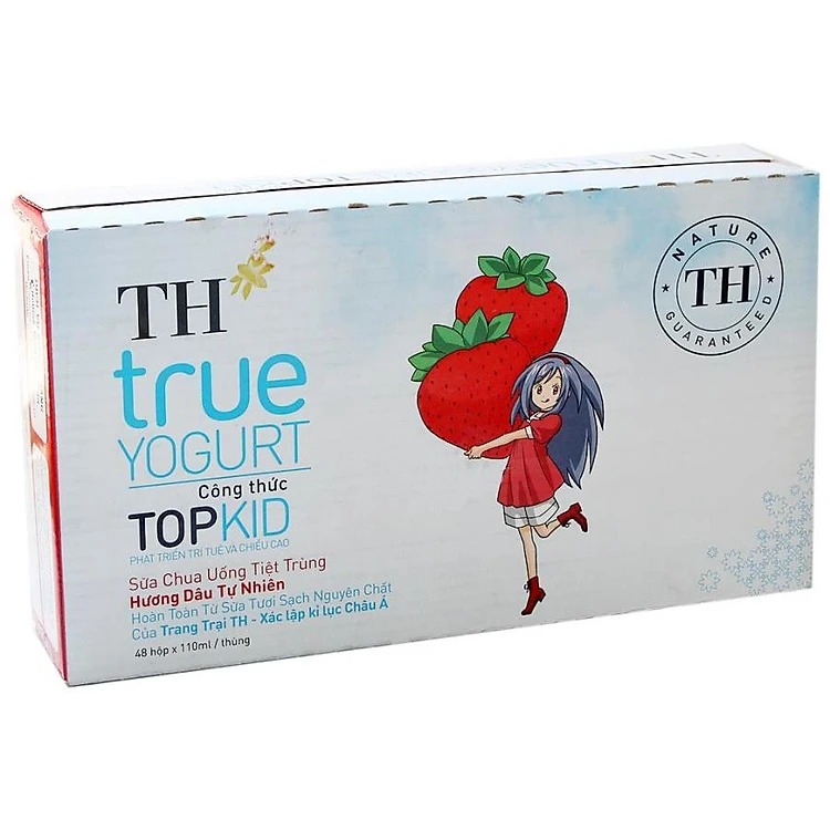 - Bộ 12 Lốc 4 Hộp Sữa Chua Uống Tiệt Trùng TH True Milk Hương Dâu Tự Nhiên Topkid (110ml / Hộp) được lên men từ nguồn sữa tươi thượng hạng, khoáng chất, dưỡng chất thiết yếu như natri, lipit, protit, lợi khuẩn, xơ đậu nành hương tự nhiên, nước, đường,...