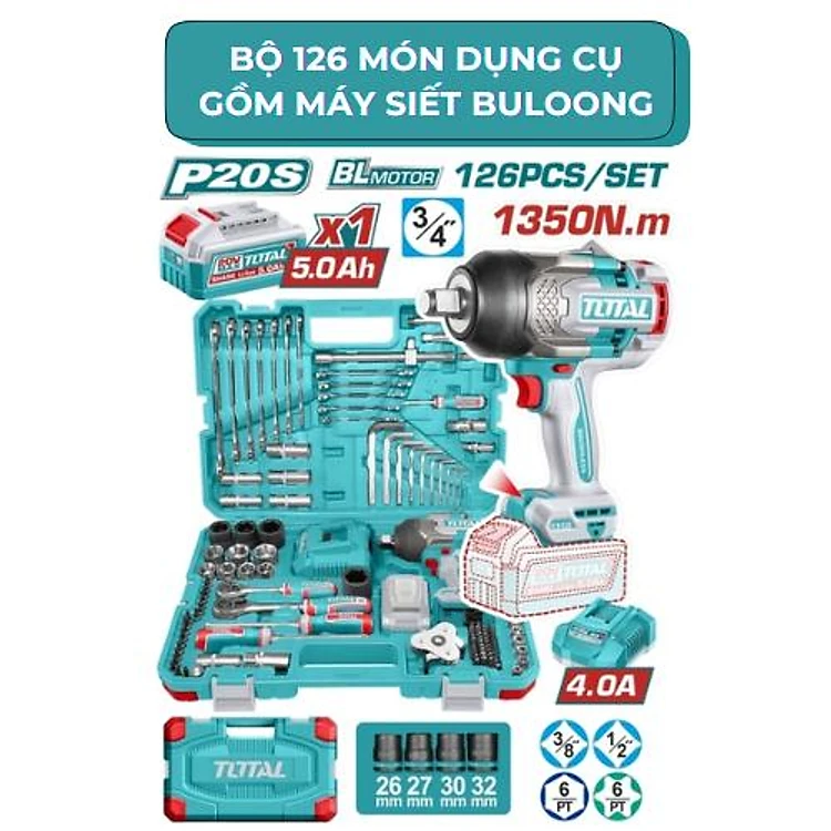 BỘ 126 MÓN BAO GỒM MÁY SIẾT BULOONG TIWLI201351KHÔNG CHỔI THAN DÙNG PIN 20V THKTHP31262 TOTAL -HÀNG CHÍNH HÃNG