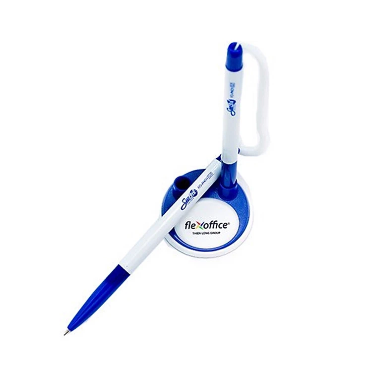 Bút cắm FO-PH01/VN xanh Bút đế cắm Flexoffice FO-PH01. Bút chuyên để trên bàn làm việc nơi đông người, bàn tiếp tân,ngân hàng, siêu thịút bền màu, đẹp, nét viết thanh, sắc nét, không lem mực, ít khi chảy mực.Sản phẩm do Tập đoàn Thiên Long sản xuất. Bút chuyên dùng in quảng cáo. Bút đế cắm FO-PH01 có đế cắm rộng, bạn có thể in quảng cáo lên đế bút thay cho chữ "Flexoffice" bằng thương hiệu của bạn. Hoặc có thể in quảng cáo lên Thân Bút để làm quà tặng cho khách hàng. Bút đế cắm thường được đặt ở nơi công cộng, nên lượng khách hàng tiềm năng sẽ biết công ty bạn thông qua hình thức quảng cáo này. Đặc điểm: - Kiểu dáng chắc chắn, Xoay 360 độ rất thuận tiện sử dụng nơi công cộng. - Dây lò xo bằng nhựa mềm có độ đàn hồi và độ bền cao. - Có băng keo 2 mặt phía dưới đế cắm, giúp giữ sản phẩm không xê dịch - Bao bì túi có tai treo thuận tiện cho trưng bày ở siêu thị, của hàng. - Bút viết trơn êm, mực ra đều và liên tục. - Đầu bi 0.7mm - Chiều dài nét mực viết được ít nhất 1000m. - Màu sắc: xanh Bảo quản: Nơi khô ráo, thoáng mát.