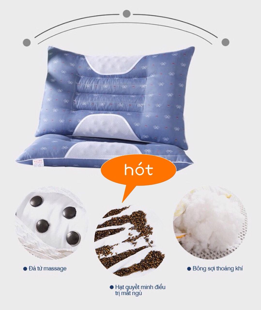 Phần giữa gối được may thành các đường rãnh nhỏ có độ cong xác định tạo form gối giúp hỗ trợ những người bị đau vai gáy. Đặc biệt hơn bên trong các rãnh này có thêm hạt thảo quyết minh rất tốt giúp dễ ngủ và ngủ sâu giấc. Hạt thảo quyết minh còn gọi là hạt muồng muồng phơi khô là một vị thuốc nam có tác dụng điều trị huyết áp cao, điều trị mất ngủ,...giúp an thần, tạo cảm giác thoải mái đem đến những giấc ngủ ngon giúp bạn nhanh chóng xua tan mệt mỏi.