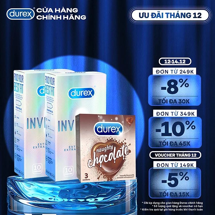 Bộ 2 hộp bao cao su Durex Invisible siêu mỏng (52mm, 10 bao/hộp)+ 1 Durex Naughty Chocolate hương choco (52mm, 3 bao/hộp)