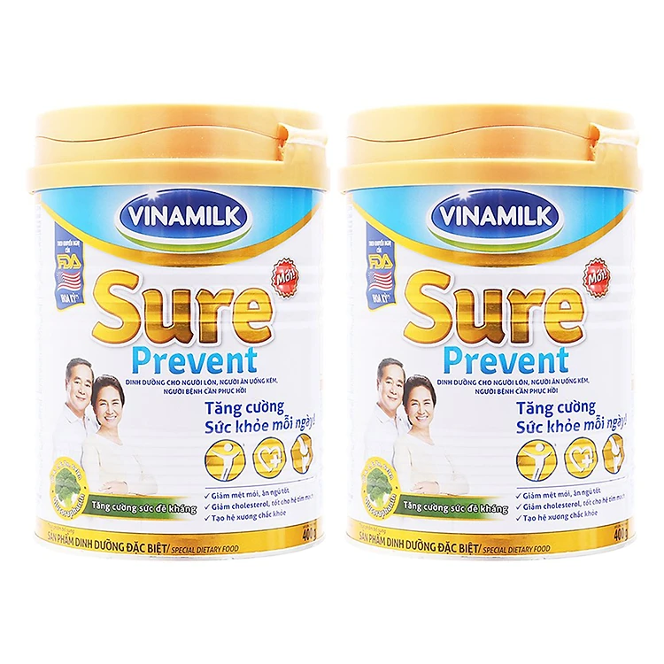 - Bộ 2 Hộp Sữa Bột Vinamilk Sure Prevent (400g/Hộp) là nguồn dinh dưỡng dễ hấp thu, đầy đủ Vitamin và khoáng chất, đặc biệt có bổ sung các Sterol Ester thực vật giúp giảm Cholesterol rất thích hợp cho người lớn tuổi, sản phẩm nổi bật với công thức 3 TỐT: giúp ăn ngủ tốt, tốt cho tim mạch, tốt cho xương.