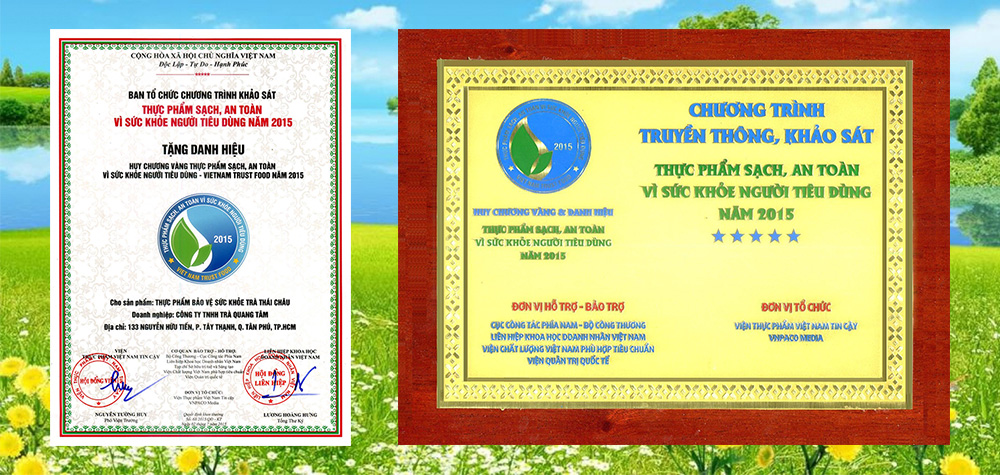 - Sản phẩm được giải huy chương Vàng thực phẩm sạch an toàn cho người tiêu dùng năm 2015.
