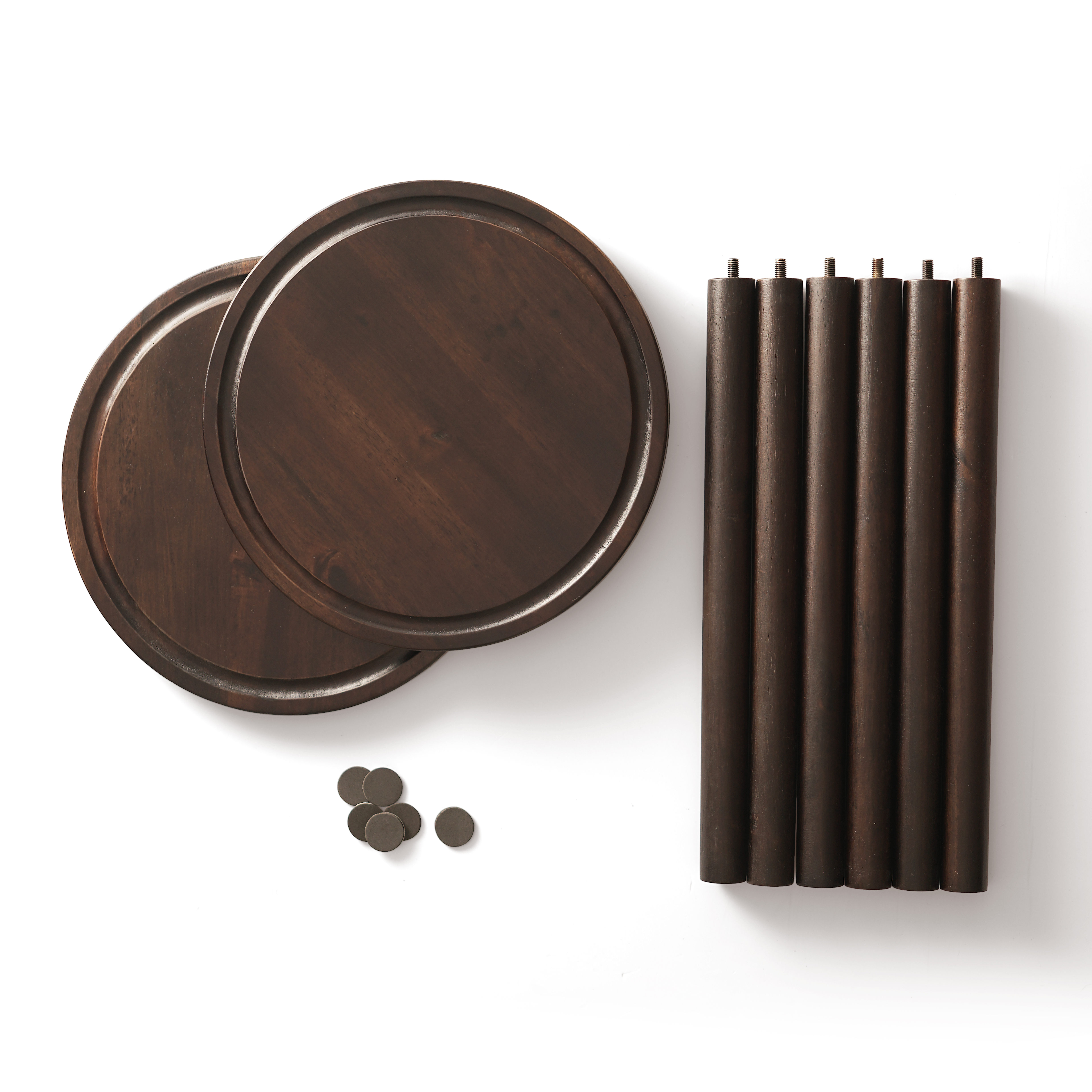 Gồm: 2 khay tròn nhỏ, 6 chân gỗ.