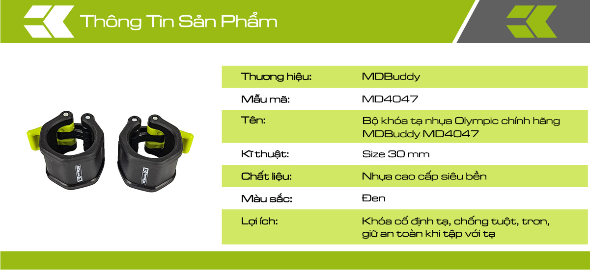 Khóa tạ là một vật dụng không thể thiếu đối với những người tập luyện thể thao. Nó giúp những người tập luyện đảm bảo an toàn một cách toàn vẹn khi tập luyện cùng với tạ. Bộ 2 khóa tạ nhựa MDBuddy MD4047 (Phi 30mm) với lớp nhựa cao cấp hơn hỗ trợ người tập tốt nhất.