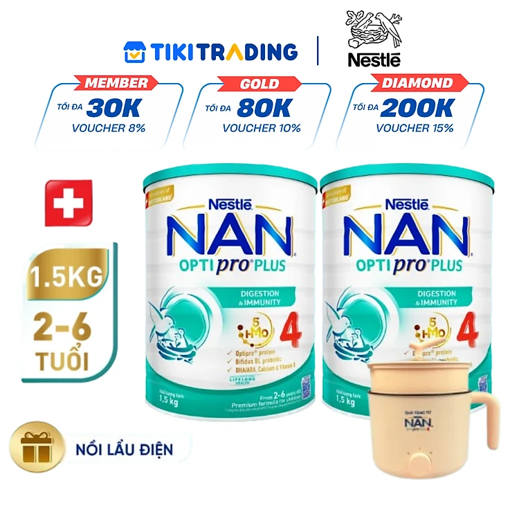 Bộ 2 lon Sữa bột NAN OPTIPRO PLUS 4 Nestle Bé 2-6 tuổi 1500g/lon Giúp tiêu hóa tốt