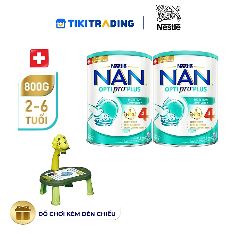 Bộ 2 lon Sữa bột Nestlé NAN OPTIPRO PLUS 4 800g/lon với 5HMO giúp tiêu hóa tốt + Tăng cường đề kháng (Bé 2-6 tuổi) - Tặng Đồ chơi kèm đèn chiếu hoạt hình
