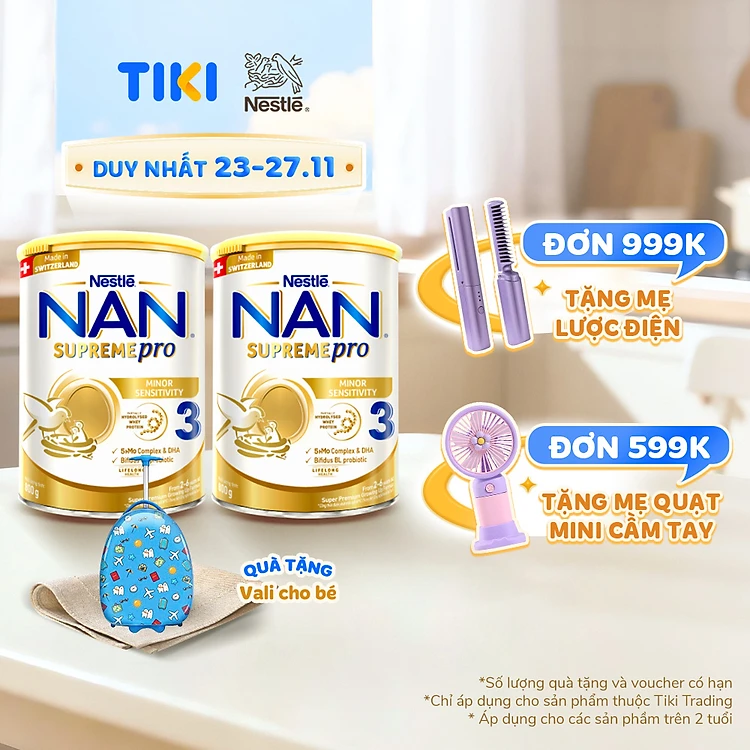 Bộ 2 Lon Sữa Bột Nestlé NAN SupremePro 3 với 5HMO giúp tăng đề kháng, đạm Gentle Optipro giúp dễ hấp thu & ngừa nguy cơ dị ứng (chàm sữa) - Tặng Vali cho bé (2-6 tuổi)