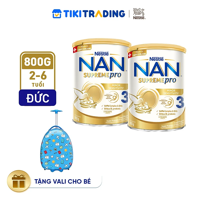 Bộ 2 Lon Sữa Bột Nestlé NAN SupremePro 3 với 5HMO giúp tăng đề kháng, đạm Gentle Optipro giúp dễ hấp thu & ngừa nguy cơ dị ứng (chàm sữa) - Tặng Vali cho bé (2-6 tuổi)