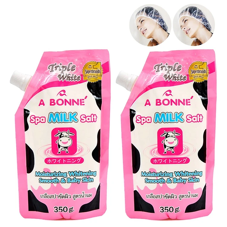 Bộ 2 Túi Muối Tắm Sữa Bò Tẩy Tế Bào Chết A Bonne Spa Milk Salt Thái Lan (350g/Túi) + Tặng Kèm 2 Trùm Đầu Khi Tắm Hoặc Ủ Tóc Trong Suốt